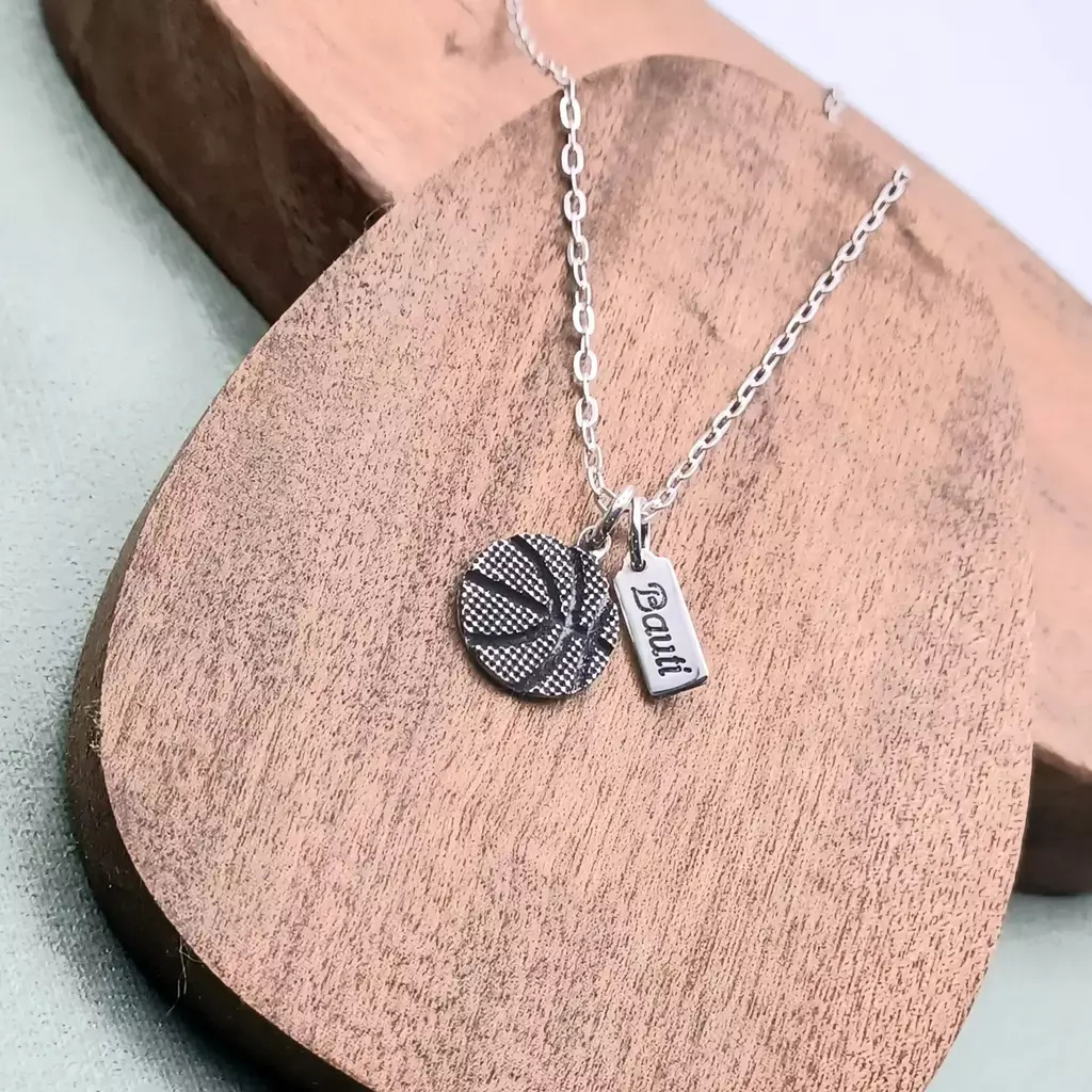 Este collar combina un dije de pelota de básquet trabajado en alpaca o en plata 925, con detalles artesanales que le dan textura y volumen.